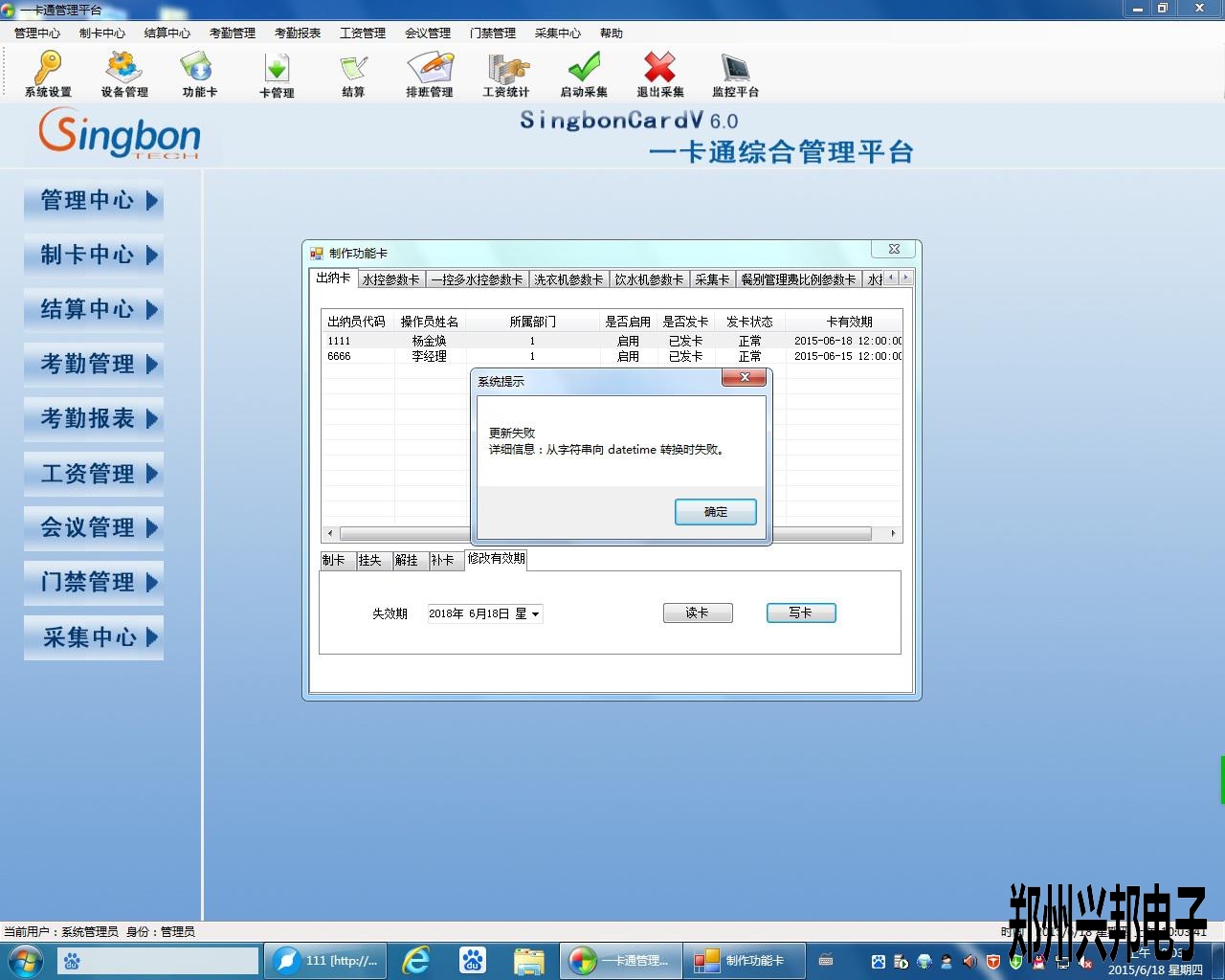 有客戶反應(yīng),在使用食堂消費機(jī)軟件時登錄出納卡的時候提示己過有效期,進(jìn)入軟件修改有效期的時間出現(xiàn)了報錯,出現(xiàn)了更新失敗,從字符串向datetime轉(zhuǎn)換失敗。這是什么情況造成的呢?